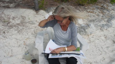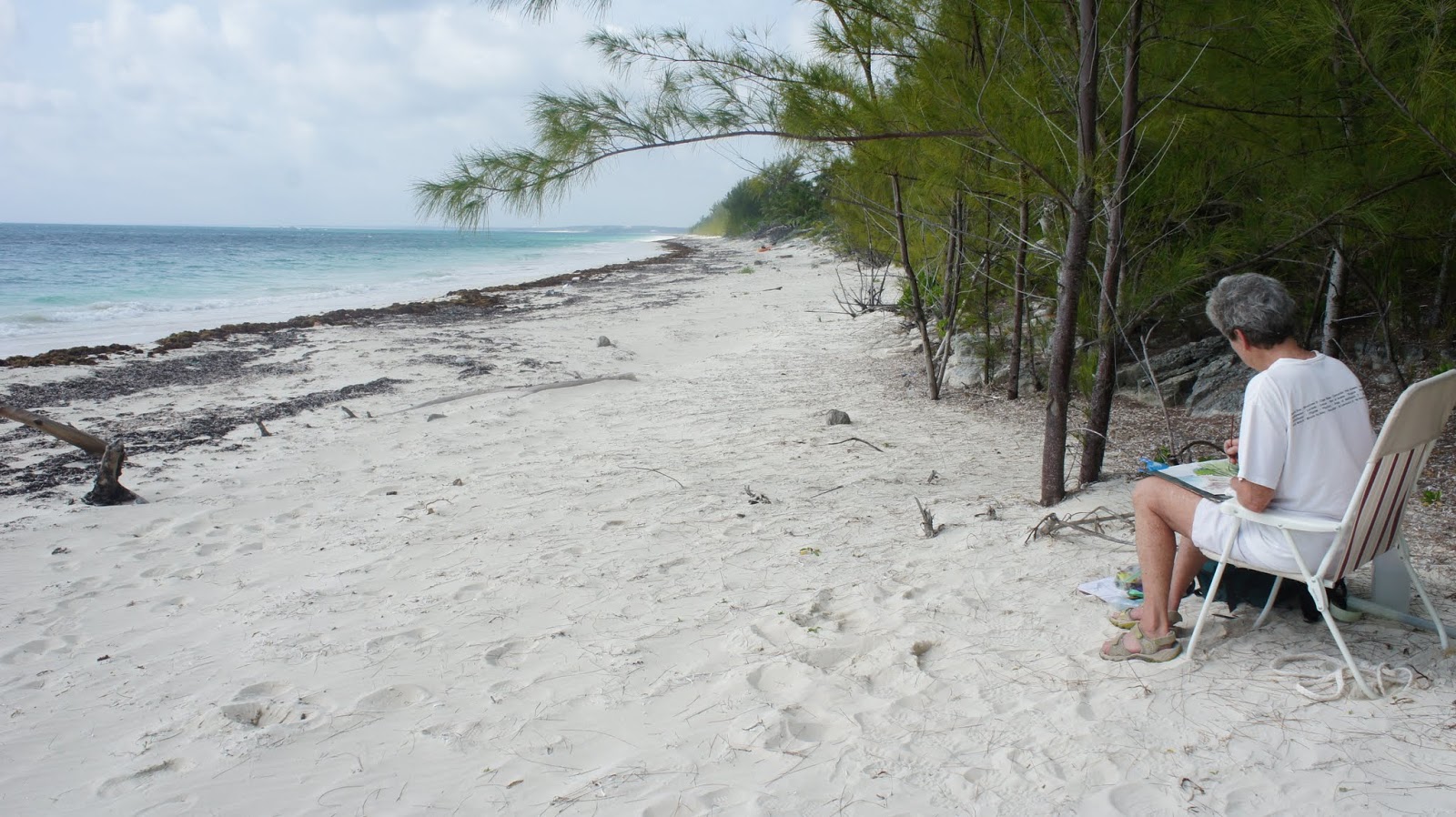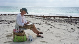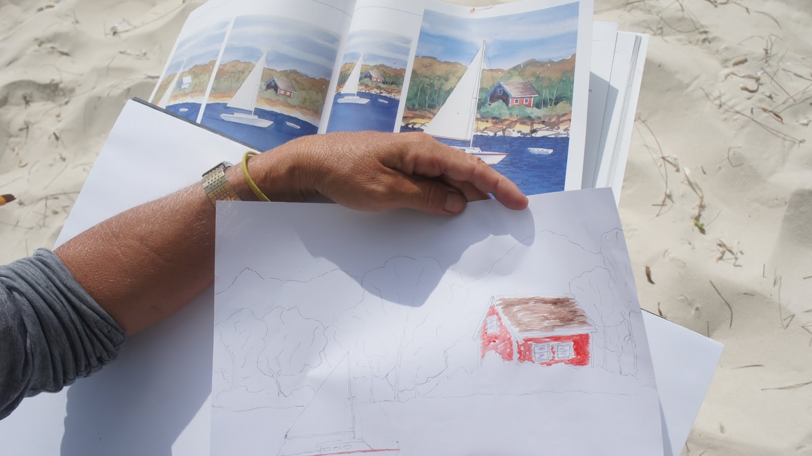 More recently, we head outside to very interesting locations such as big beaches, marshes, ponds, old roads and paint there. It is usually quiet for several hours, as each of us works on sketching and painting. We photograph the setting in which we are working so that we can revisit the colors we choose, the structures and shapes we draw. After an hour or so of quiet, we begin walking from one place to another, looking at each person’s work and commenting on what we see, asking questions, or comparing approaches to our work.