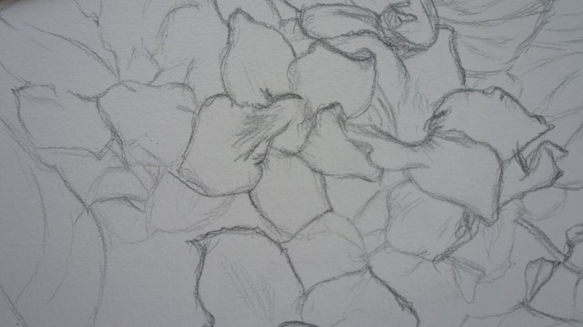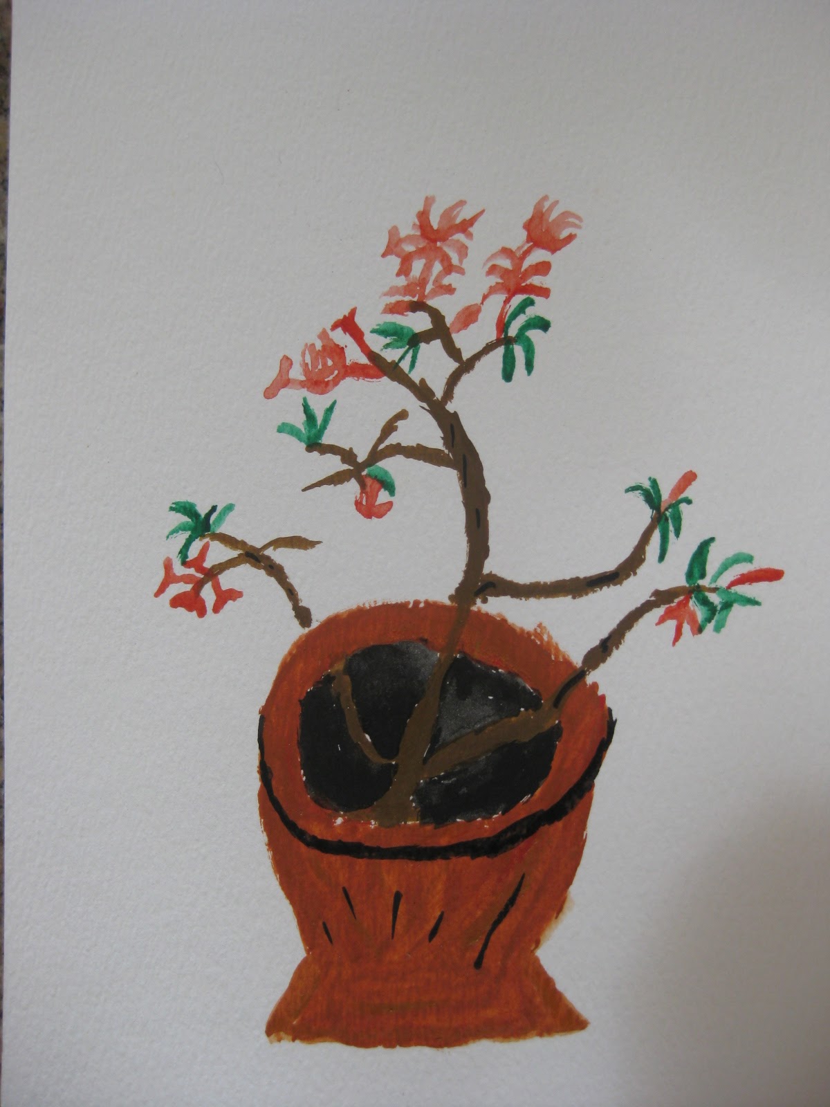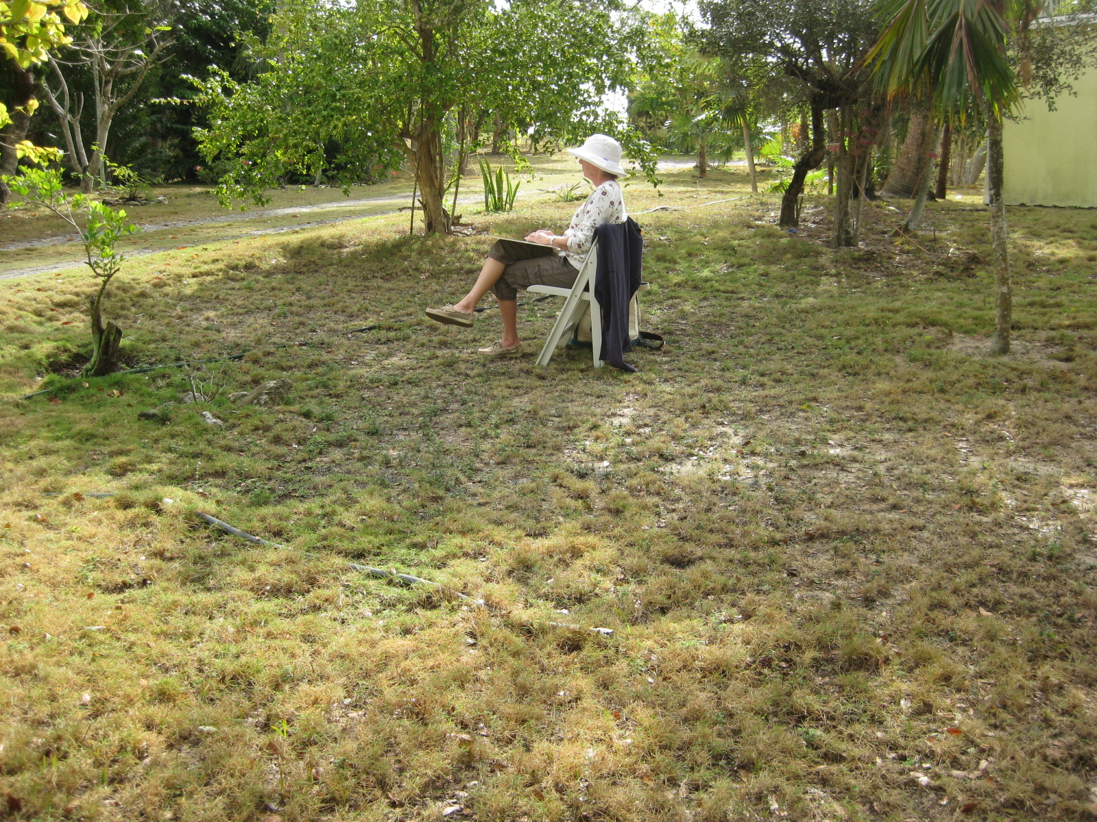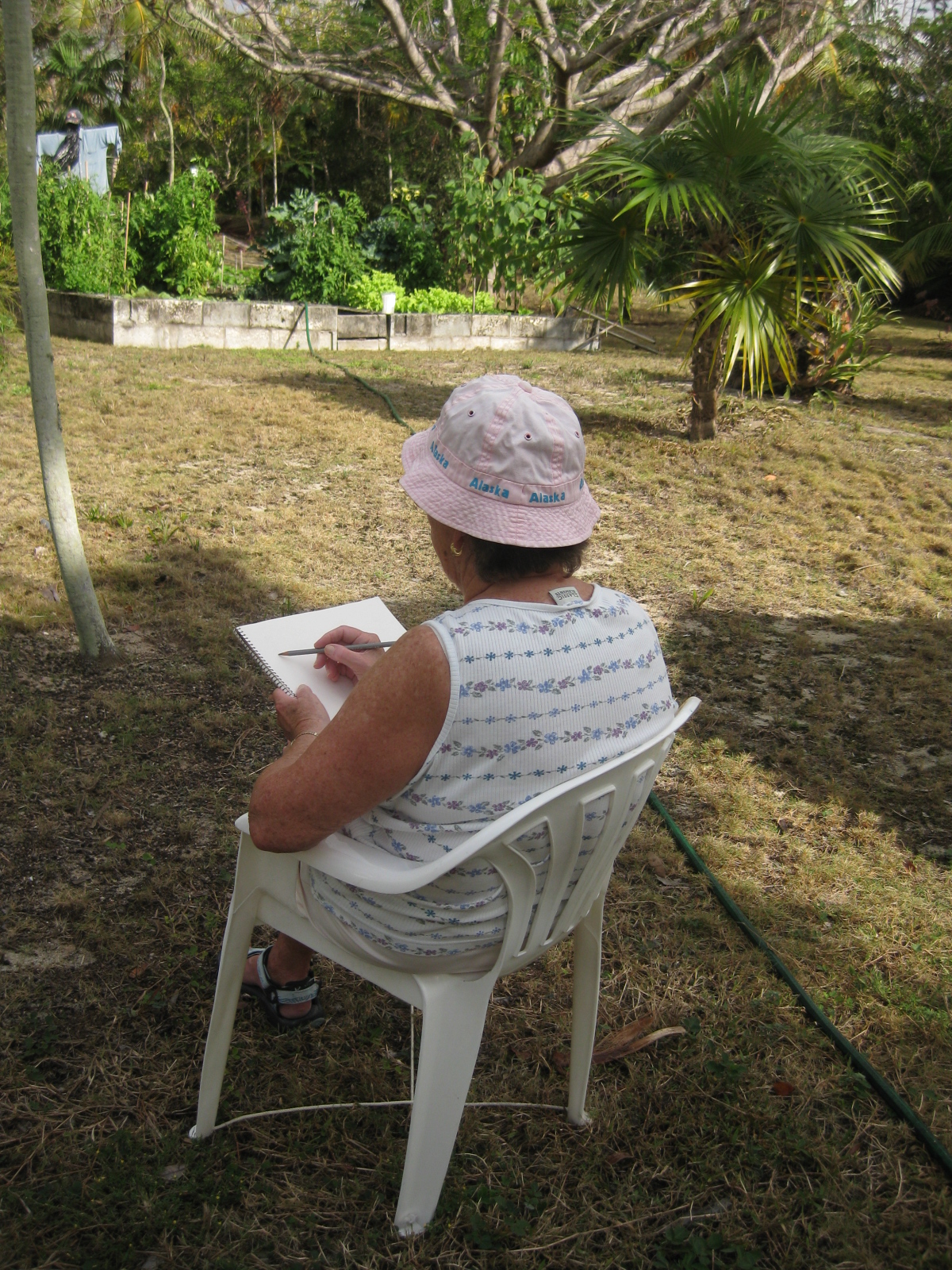 Our meeting usually begins at 8:30 each Wednesday morning. We agree on where to meet outdoors. We gather at the designated place and speak with each other for a few minutes when we first arrive. We then casually disperse, carrying our chairs and our art supplies to various locations nearby, walking around to find a place to put our chair and establish a point for painting. We next pull out our paper and paints, our pencils and erasers,brushes, and set to work.