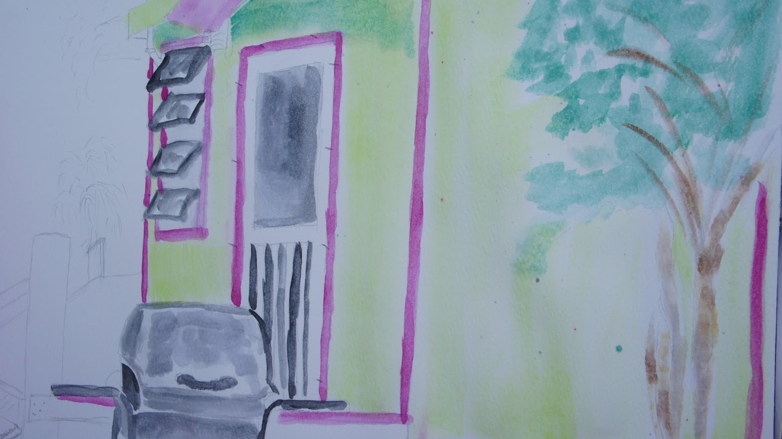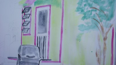 Our High Banks neighbors have interesting points of architecture, unique gardens, great trees, striking fences, friendly dogs, amusing automobiles. They kindly agreed to allow us in their yards and on their porches with chairs, paints, and trampling feet.