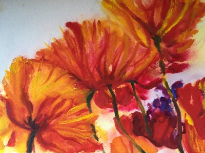 Orange lilies bob their headsreaching out above the hydrangeasdelicate flickering petals flyingsedately touching summer hot streams of light.