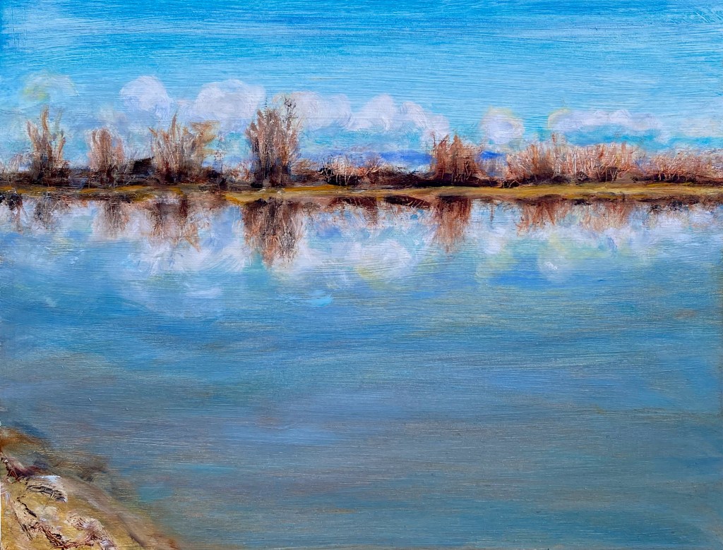 This quiet moment is in March and occurs while walking off-road at Sauvie Island, near Portland, Oregon We are standing in a field, looking at almost still waters. The scrub bushes and small trees on the other side of the pond are sending what looks like a calligraphic message, punctuated by clouds.