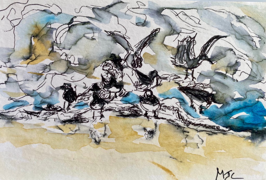 What is it about this tiny watercolor painting that feels so big and bold? It is actually a very small painting, but I feel that it has the sense of being large. I like the way that the reflections and shadows of the birds dance around in the swirling sand and water. The birds’ dark shadows disrupt the soft blue, reflective water as ocean waves press and pull the birds inward and outward, while they scurry around and search for food.