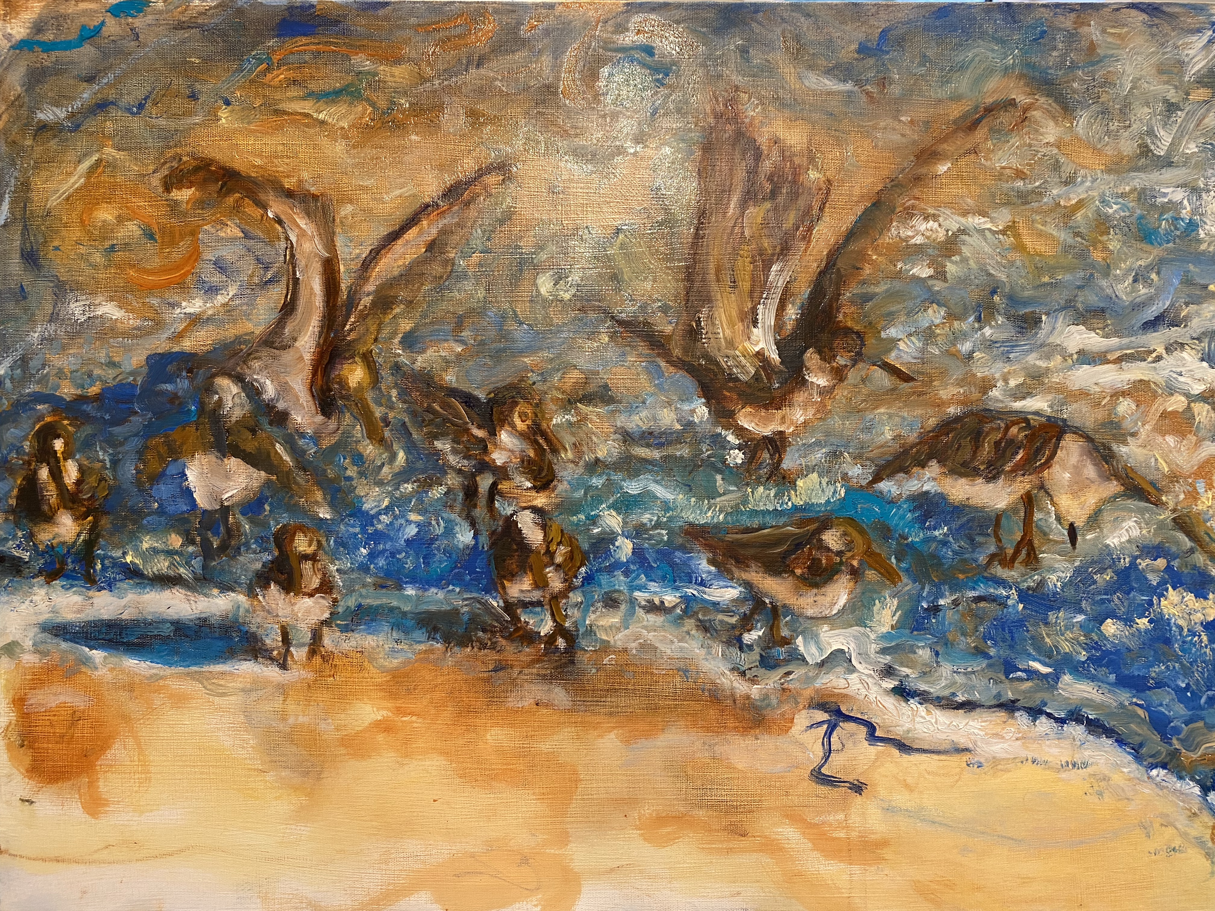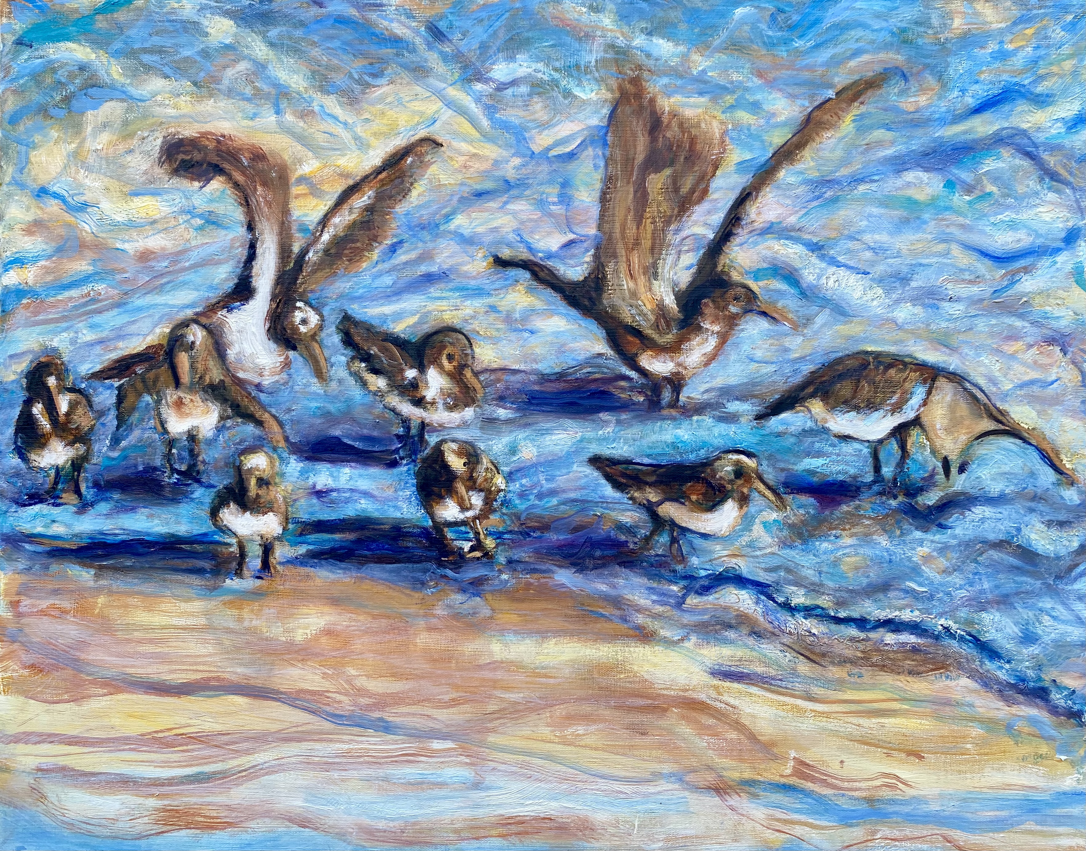 In the end, I chose to leave the final painting lighter, softer, and less moody than how I started, mainly by smoothing out the ocean water’s movements and lightening it up through a series of tonal washers, or glazes. In the finished painting, the beach was a softer, lighter color of browns than the dark brown birds with their white bellies, offering some contrast between them, but not creating strong calligraphic marks as I initially had. Here is the result.