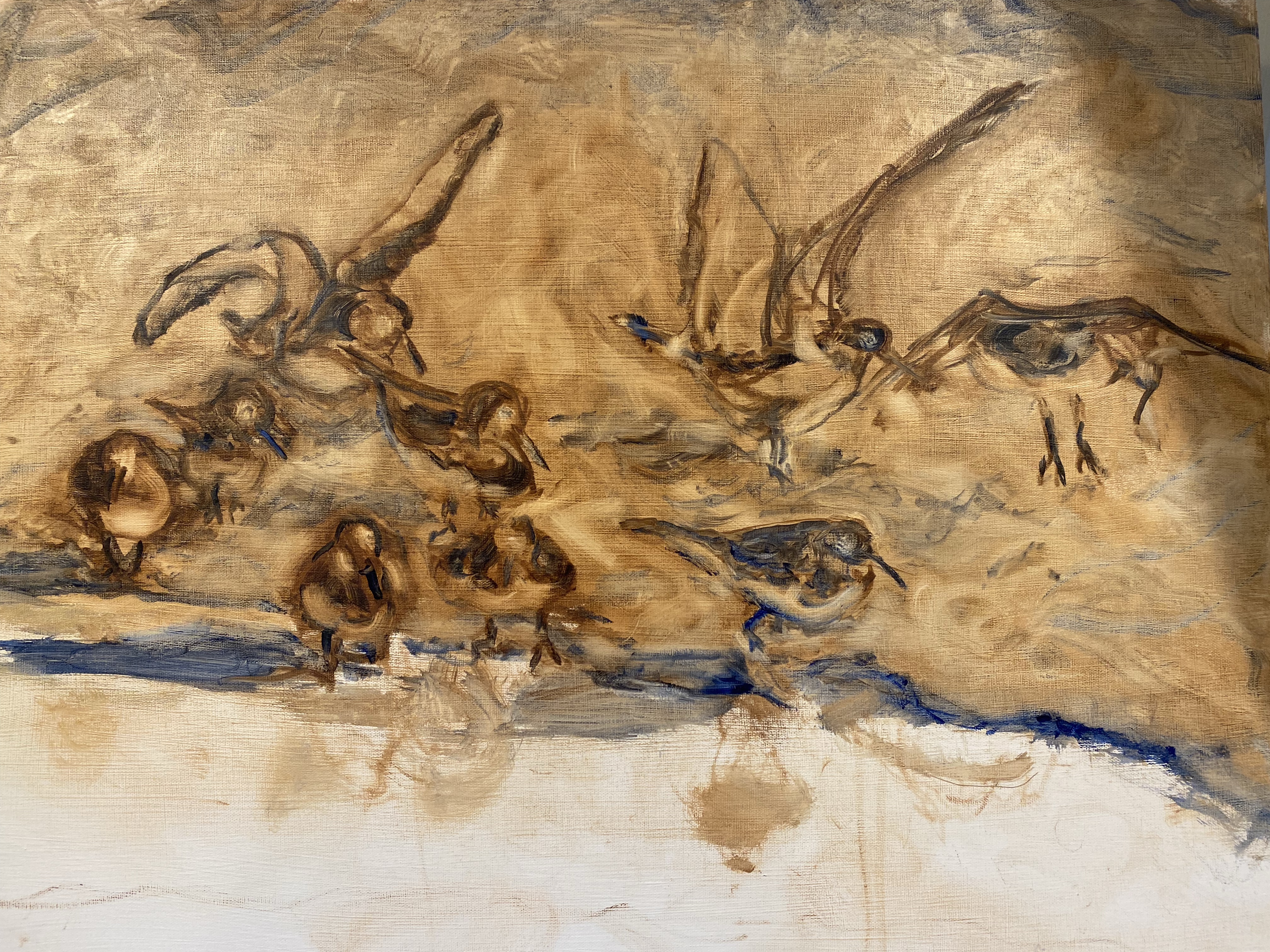 In my earlier attempts to paint these birds, I figured out their positions and got them arranged and interacting with the water in useful ways, but still felt that there was more to do than simply positioning. Somehow, the division between birds and water held and I wanted them to be more intertwined. I wanted the birds to be in transition to flight and to represent this by mixing the various approaches to water, the concept of time, the colors of reflections, making it more chaotic. This time, I feel that I got the movement back into the painting as I had initially wanted.