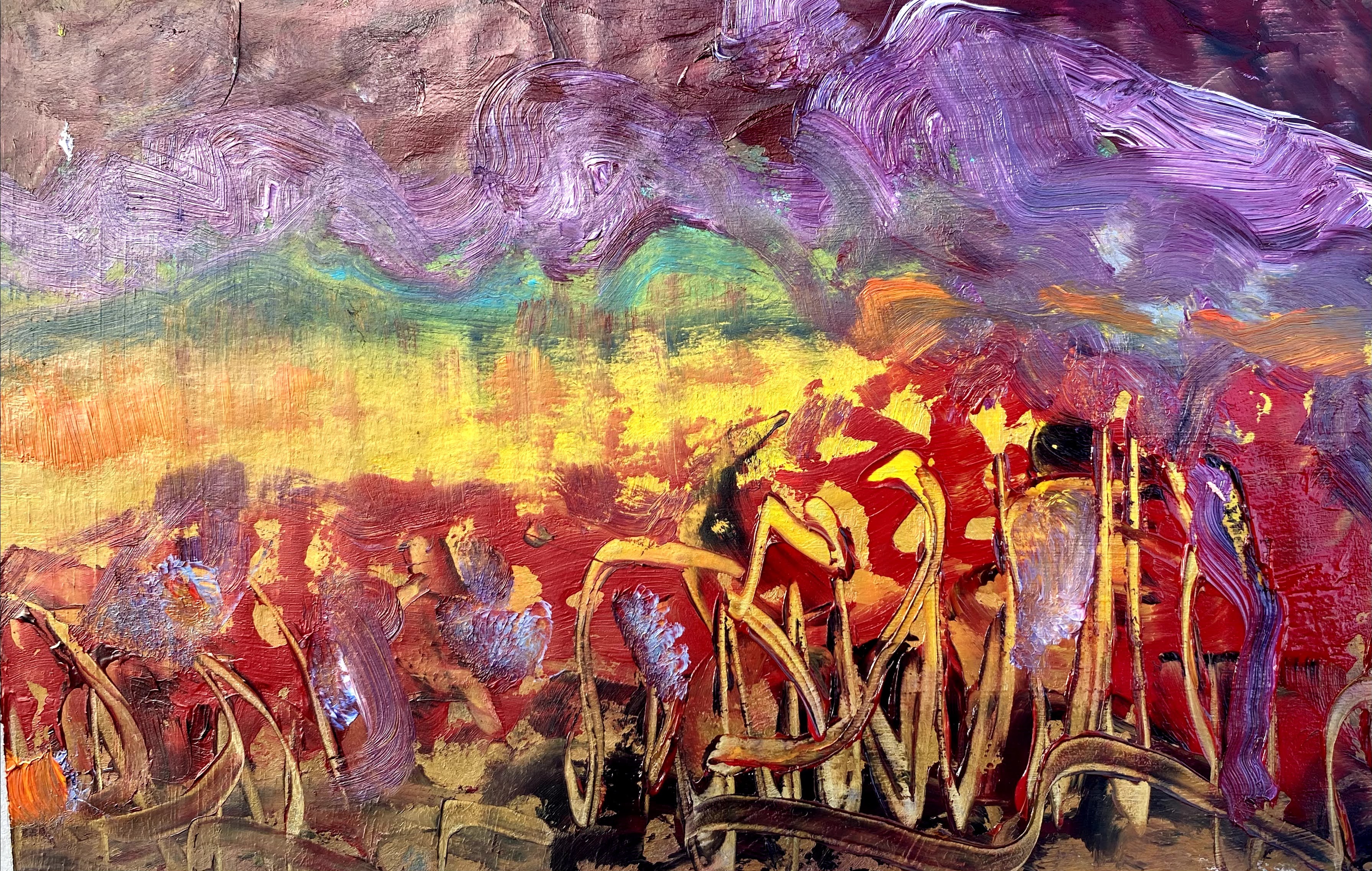 This is an unfinished painting. I have ideas how to soften the red water on the right side and want to do some glazing to smooth out certain parts. For now, I am not touching the painting because it needs to dry a bit before proceeding.