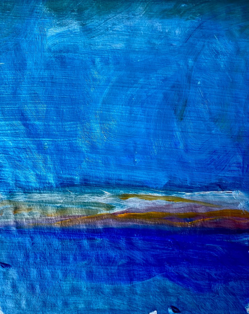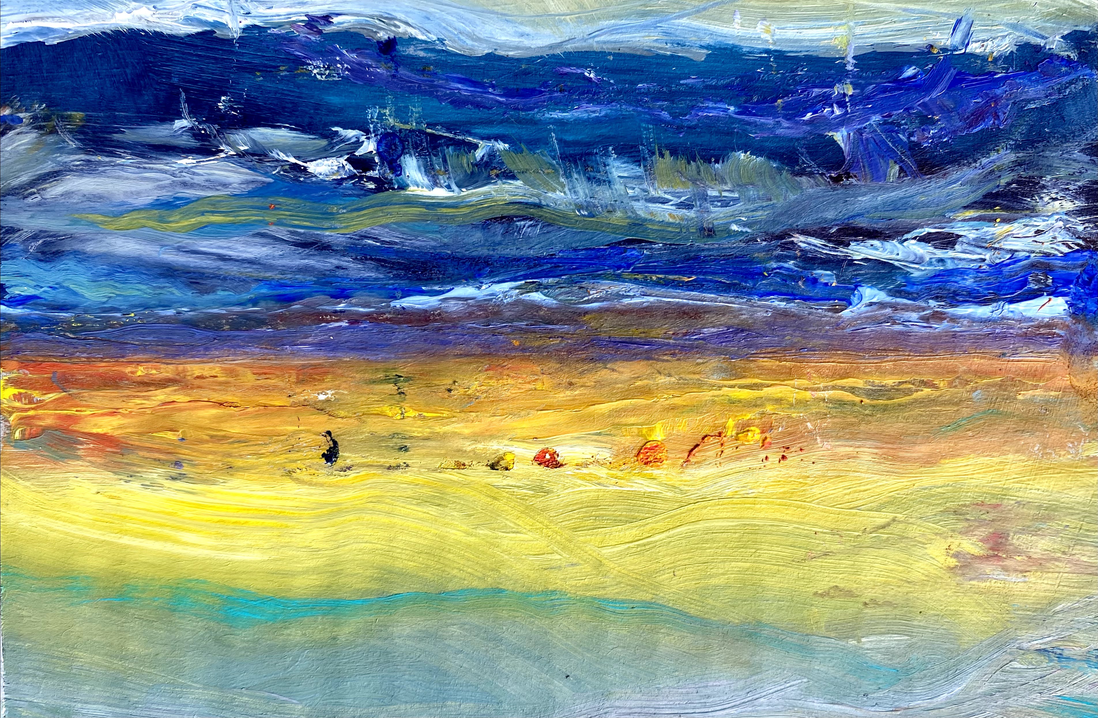 Where should the person and the bird be positioned? Should their lines be hard edged and realistic or might these objects be better depicted in a more abstract and reflective way? Should they stand out and burst with color or be more tonal in nature, positioning themselves smoothly between water, sky and beach? When and where should the sky, and the water erupt into being? How does light run through this?