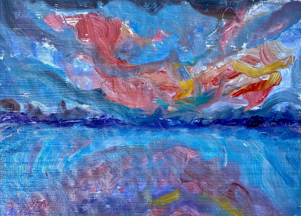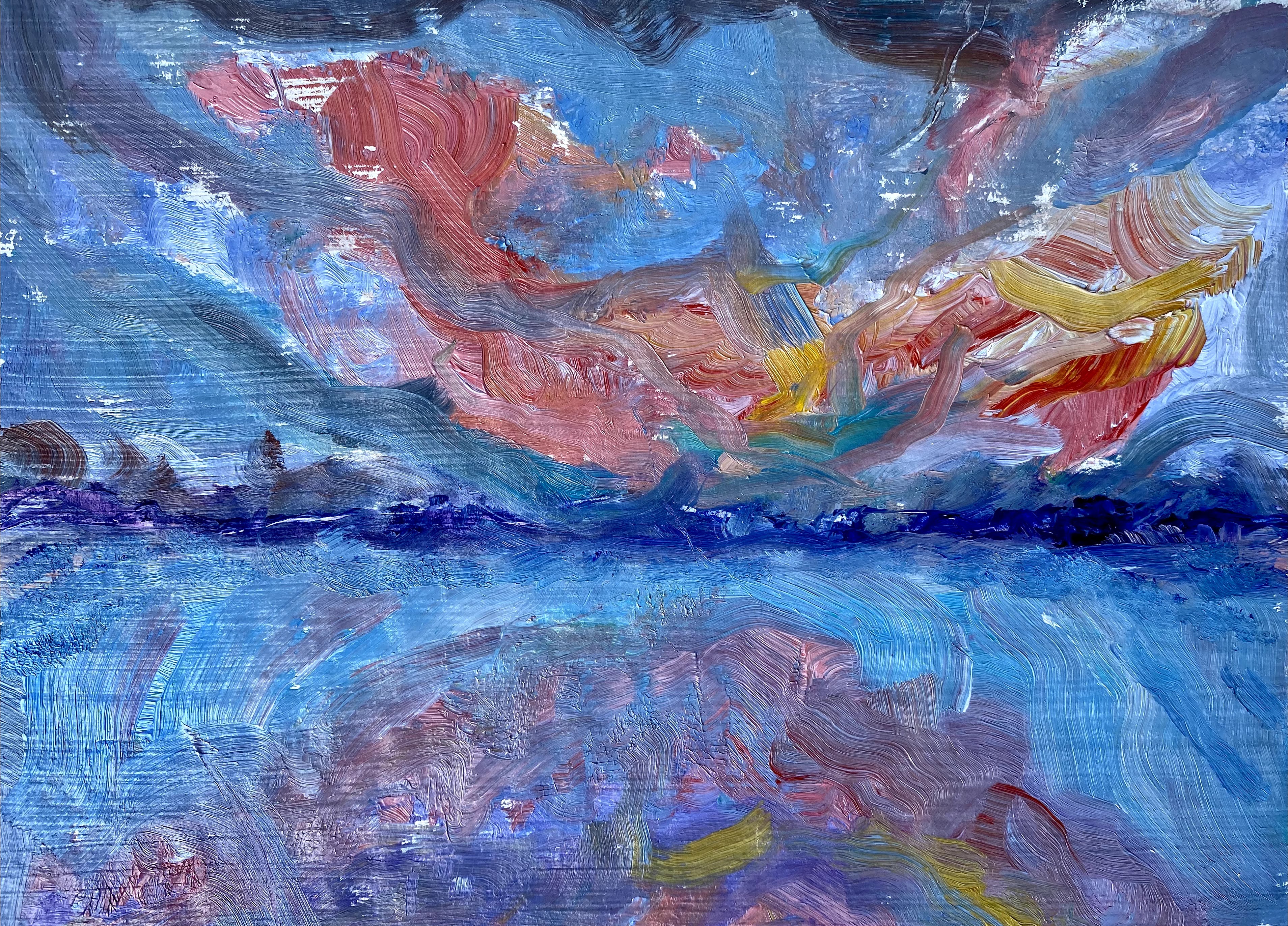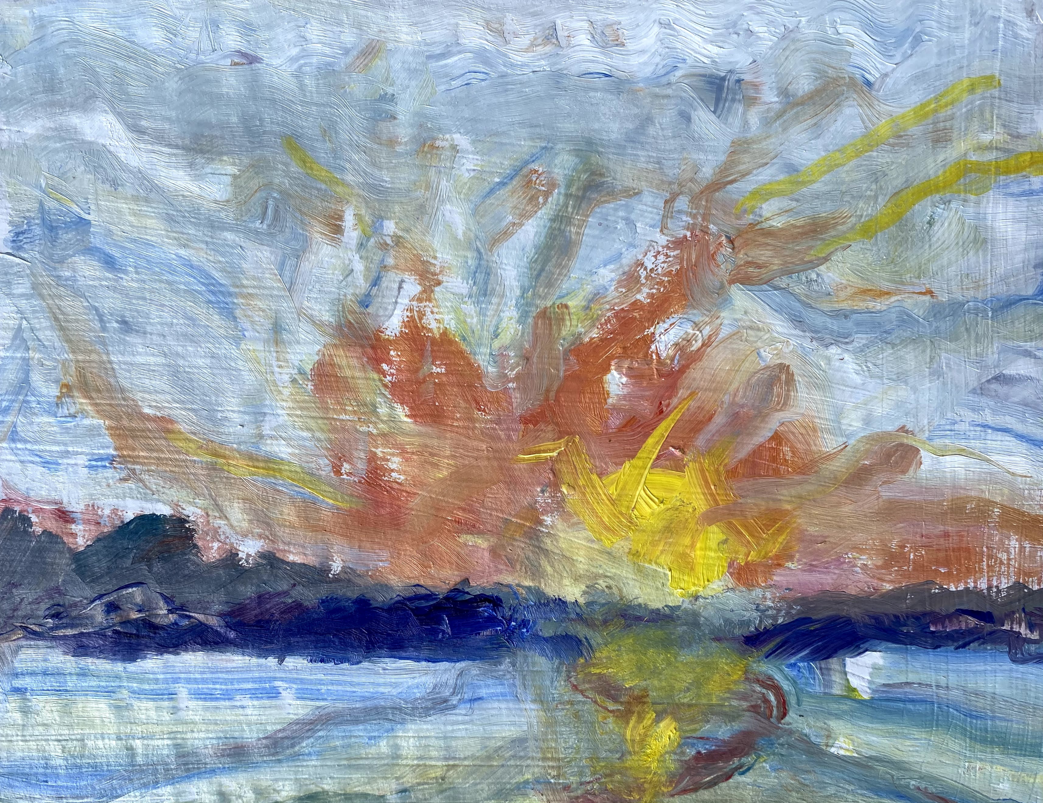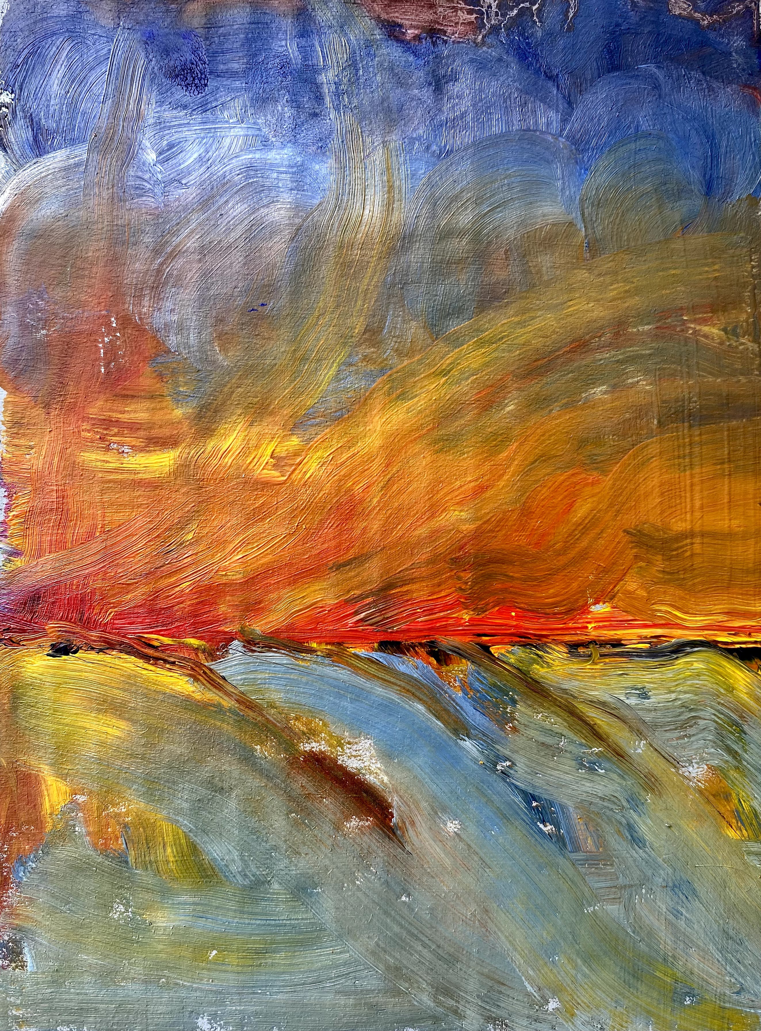 Sunset over water, playing with Oils on Gessoed Cardboard Volcanic eruptionAncient tales Cool meadows