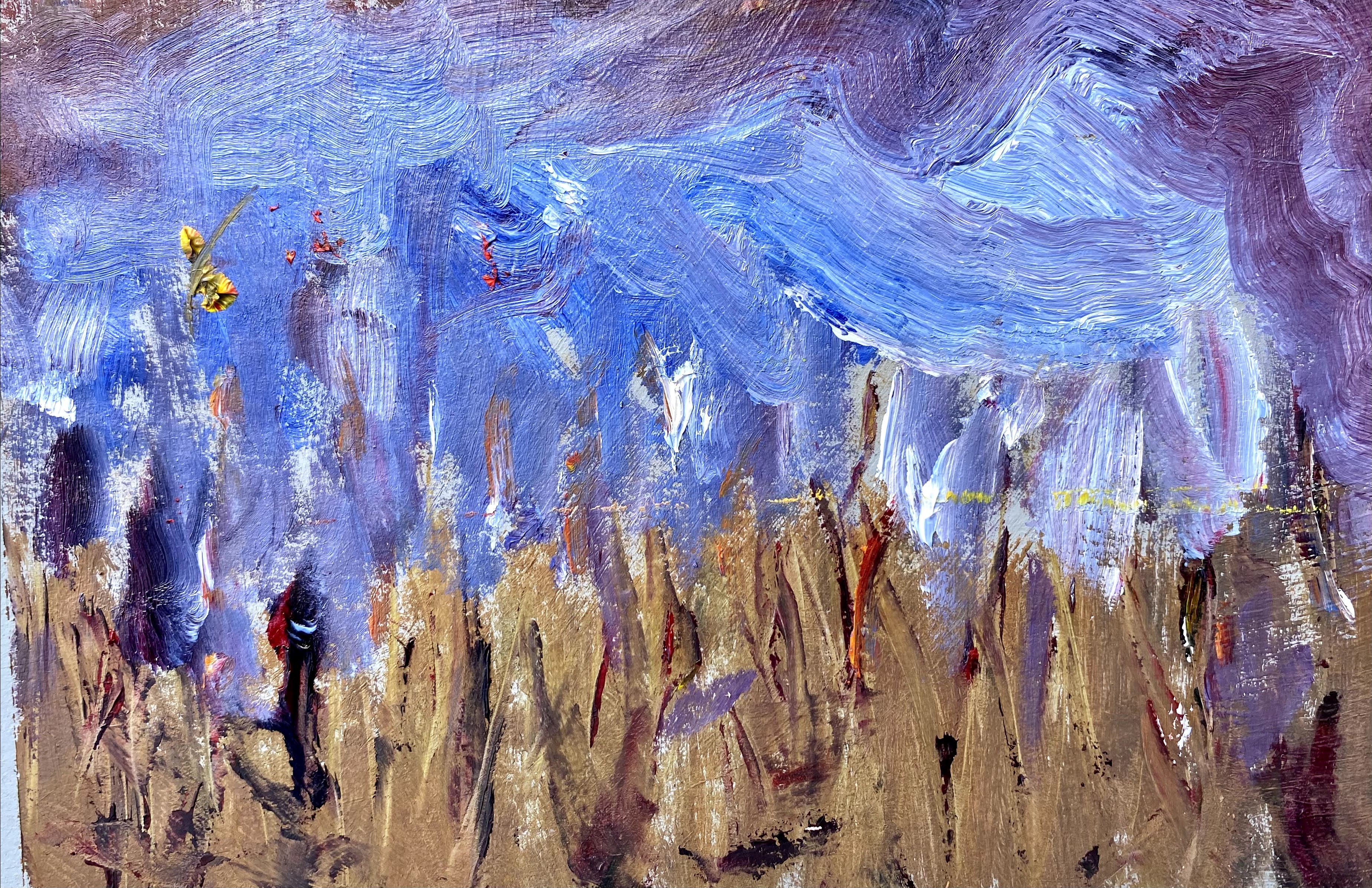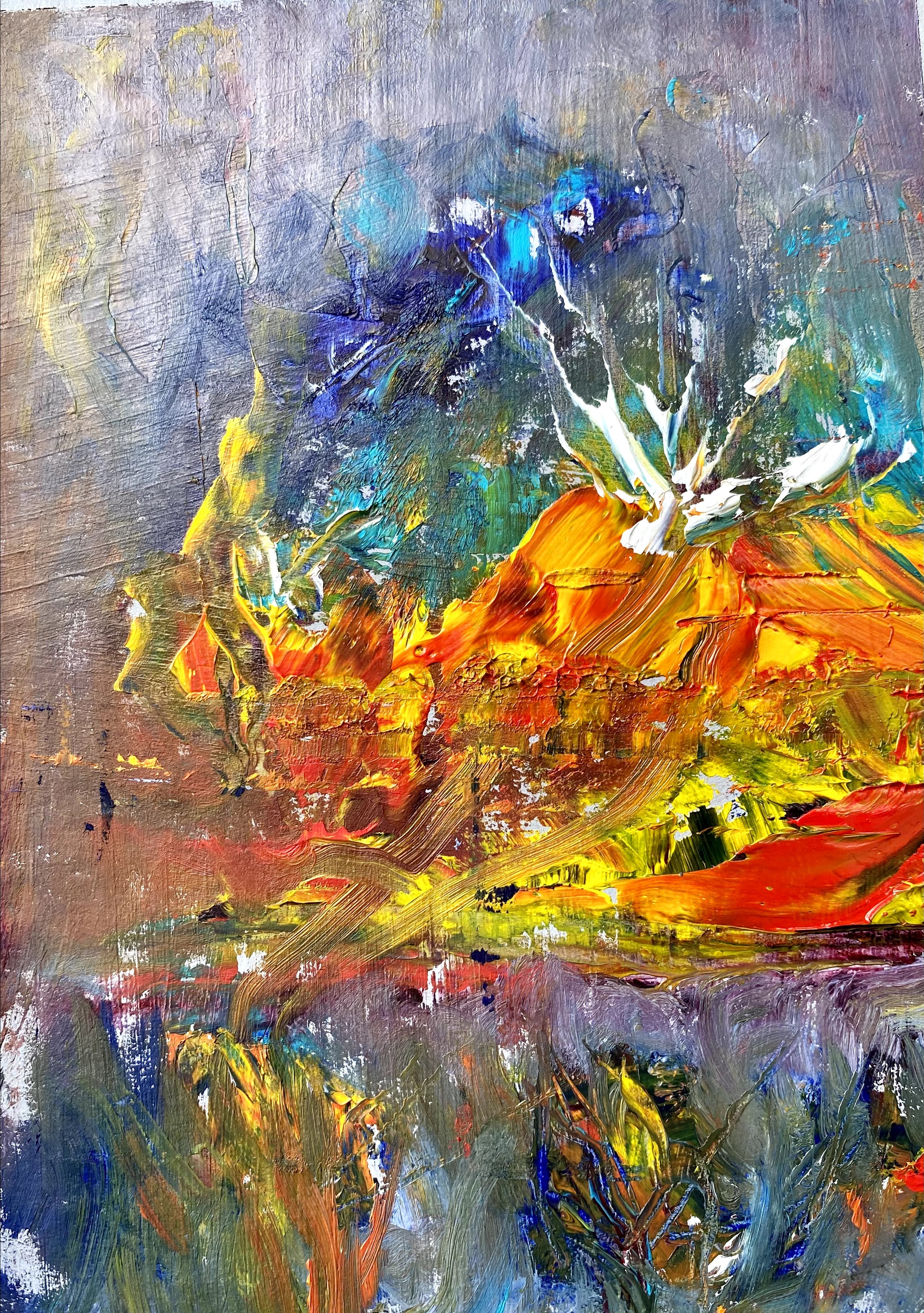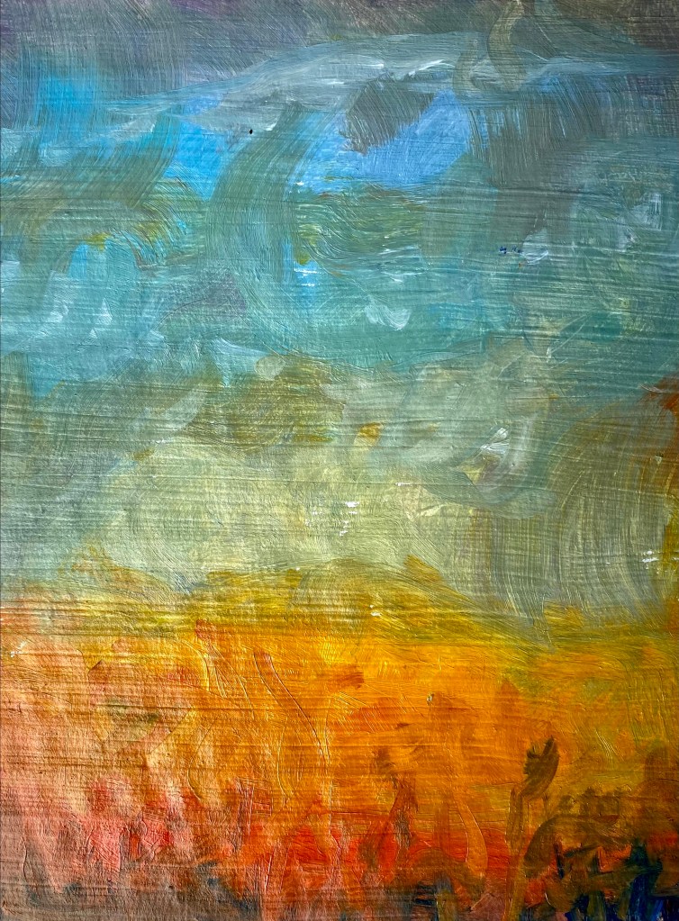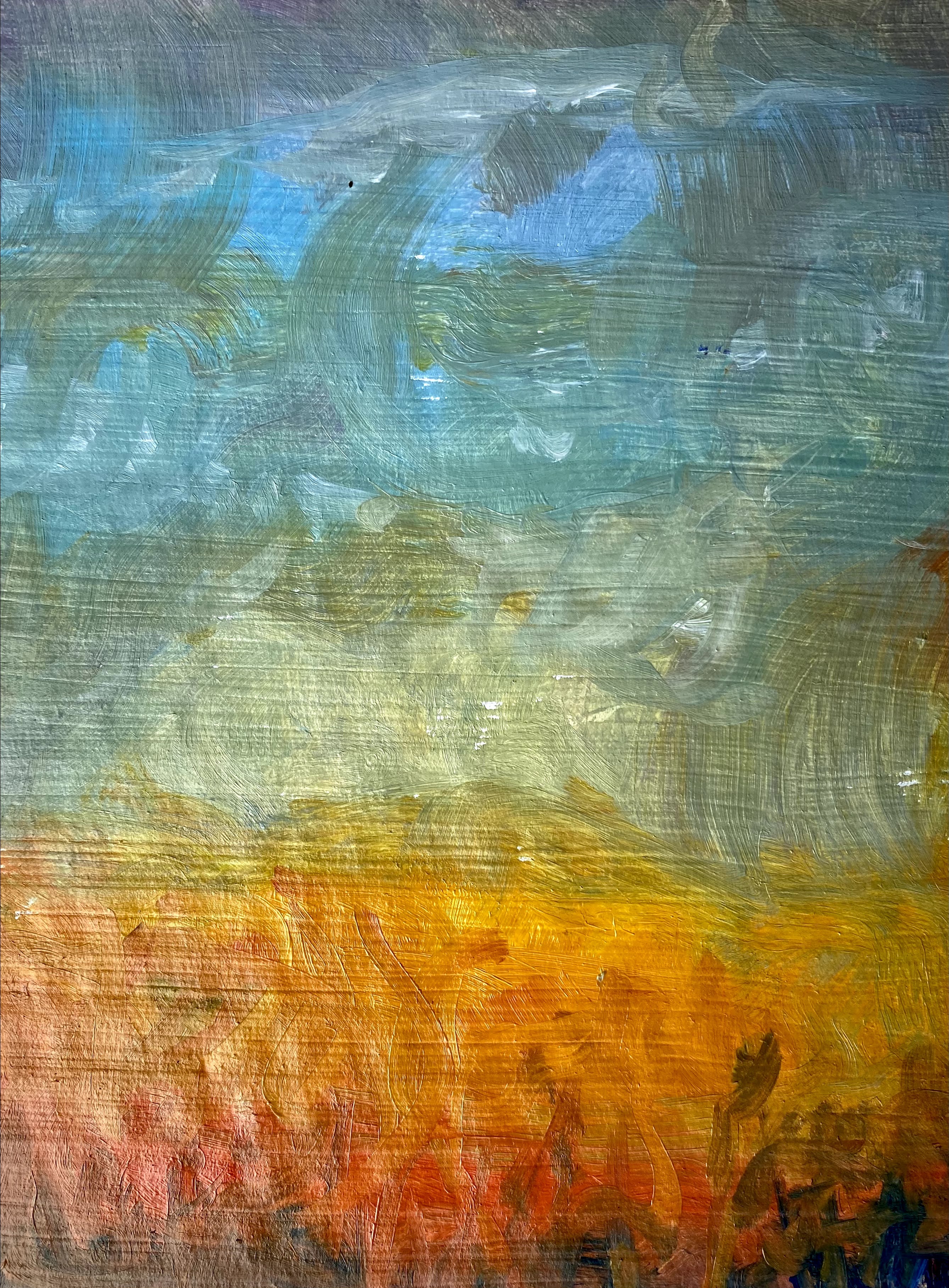 Sunset over water, playing with Oils on Gessoed Cardboard Volcanic eruptionAncient tales Cool meadows