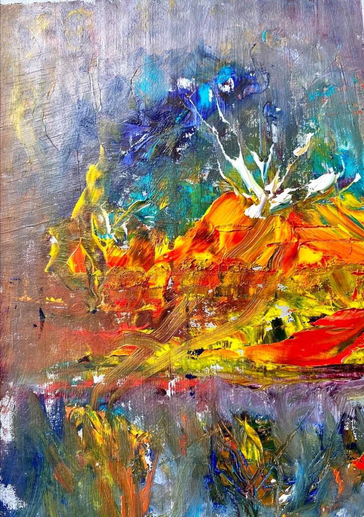 Given our current use of delivery services for groceries, home staples and art materials during the pandemic, we all have plenty of extra cardboard around. Prior to this art class, I had already started using cardboard as a readily available cheap canvas for my oil and acrylic painting exercises. I don’t worry so much about how the painting is going to turn out, but play with the art scene instead, knowing that my relationship to this canvas is “temporary.”