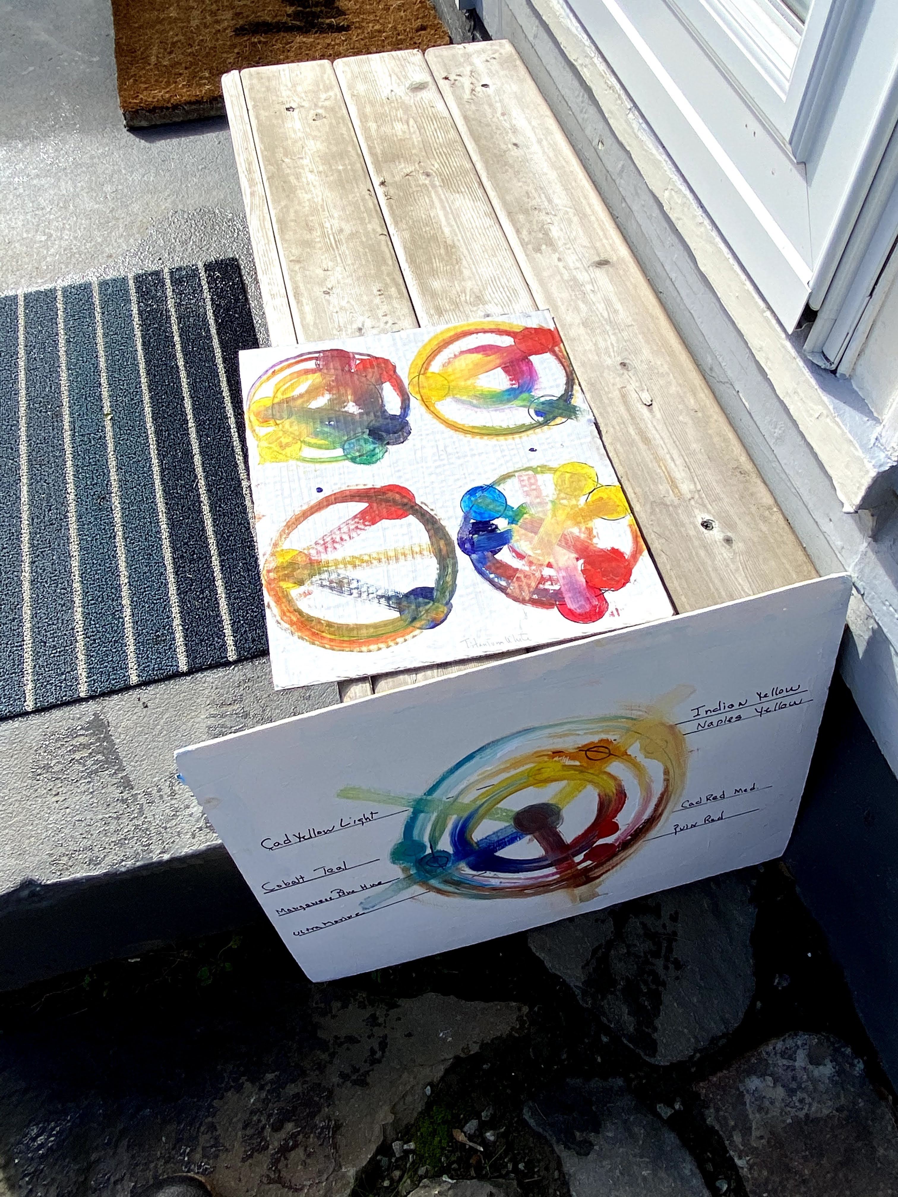 This week, I gessoed some cardboard, taped it up into various sizes of squares and started experimenting with colors. At first, I played with the basic four or five colors we will be using in this course as our basis for mixing an essential palette.