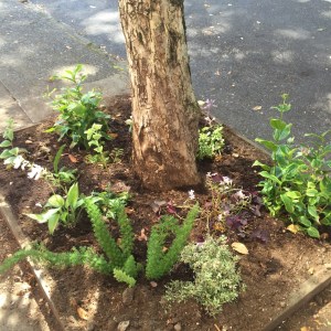 I recently decided to adopt a four foot square area out in front of our condo that has a tree in the middle. This small piece of land is right next to a main thoroughfare and cars often park next to it. Because nothing is on the land and it is shady, because people step on it, because dogs water the tree and wander freely across the dirt, plants haven’t grown.