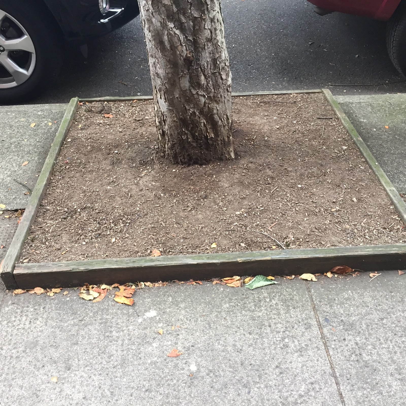 Small front yardSpace between sidewalk and street. In the middle is the tree called Persian Ironwood or Parrotia Persia, a city approved tree. Front yard next to sidewalk