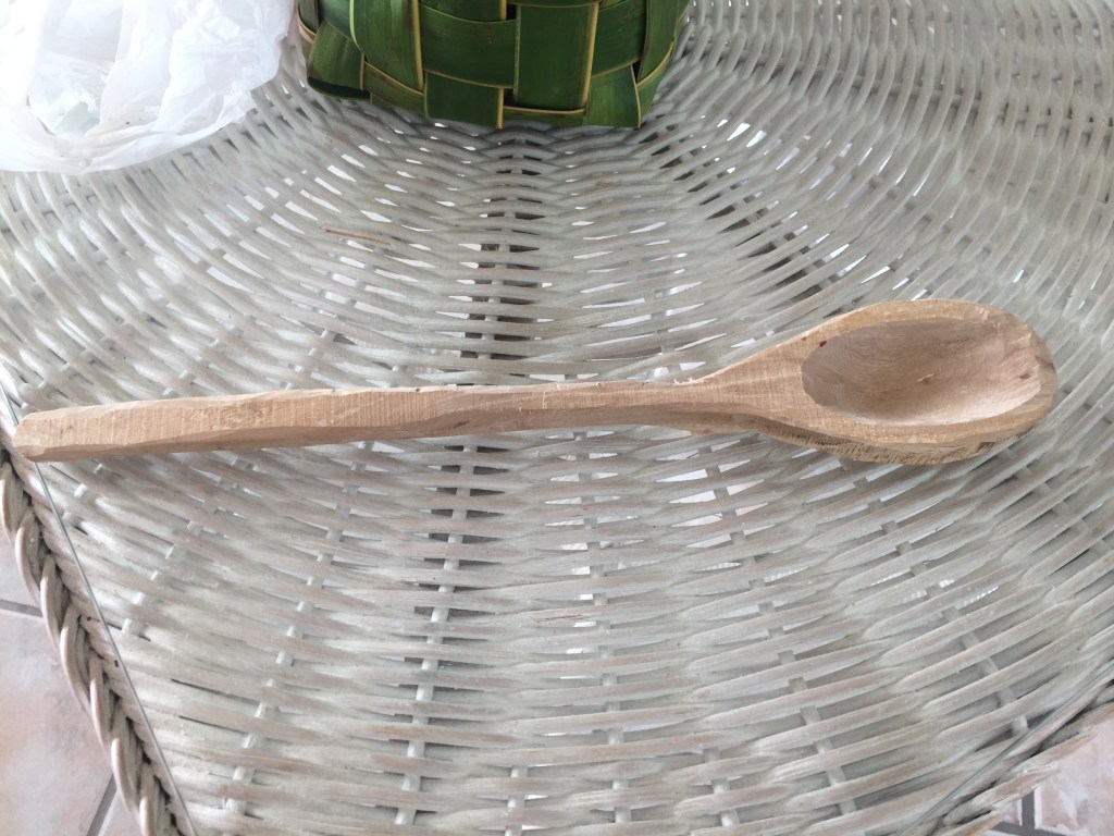 Buttonwood branch cut and shared by a neighborCut with a saw into a spoon shape by another neighborBeing hand carved by a wood carver, not yet finished