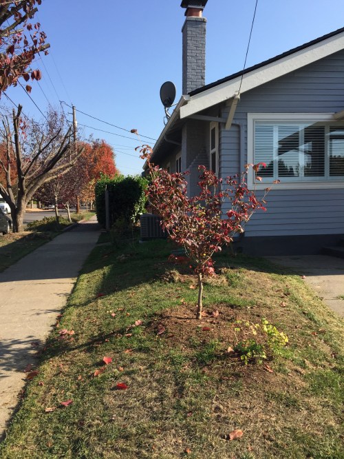 Front yard at starting point. Three native bushes, or small trees, planted.