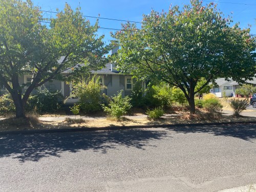 Five years later, in 2023, we are still working with this general concept of a native plant landscape for our yard. I recently photographed our front and side yard to show how it looks in August during a particularly severe dry period. We have had no rain for several months.