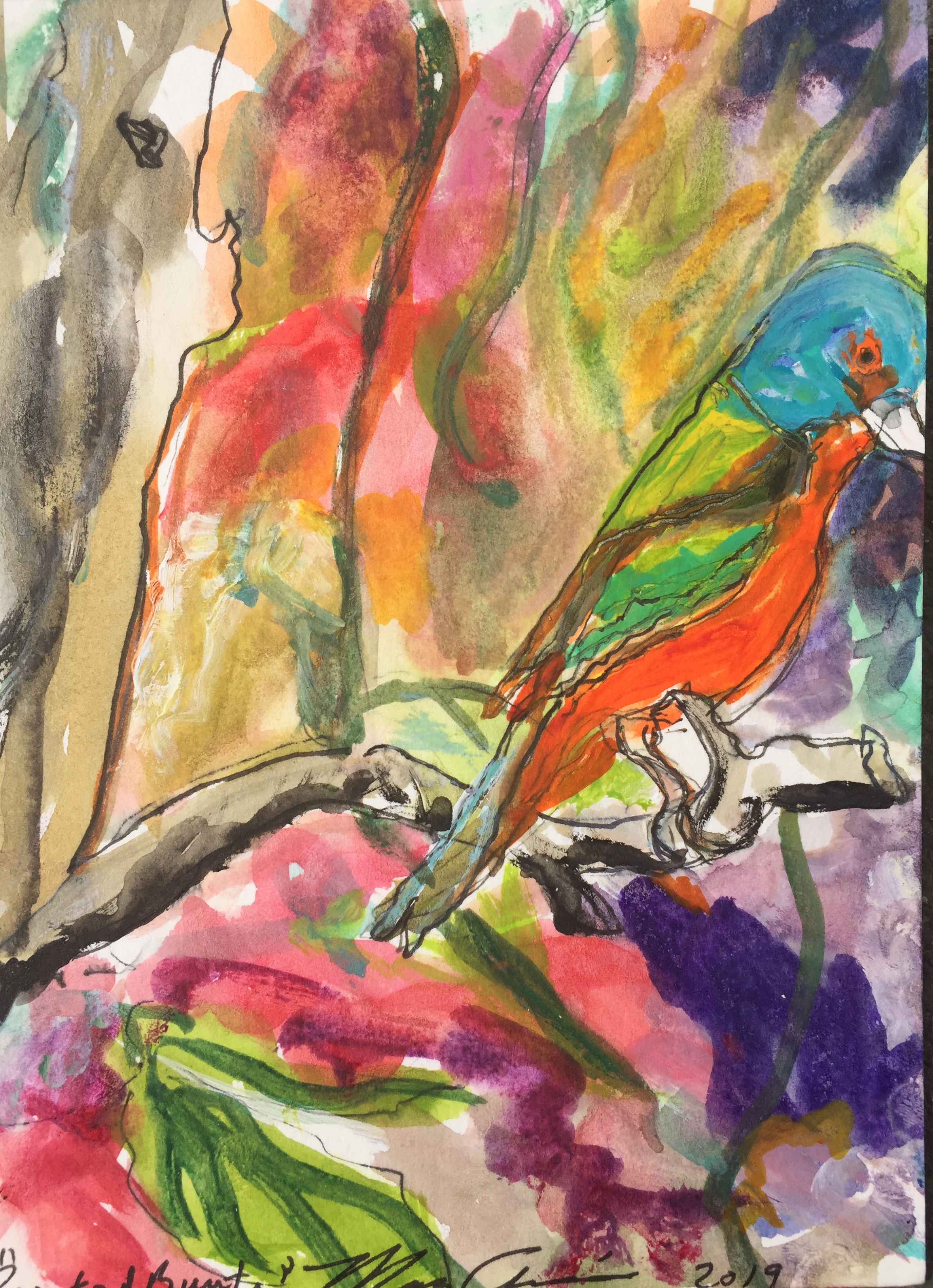 The idea of painting a bird series started when I was doing a small watercolor on one of those commercially produced blank watercolor cards that I planned to send to a friend (Perspective 1). Unexpectedly, this small watercolor painting on a greeting card became a source of inspiration for an exploratory series of paintings experimenting with alternative media.