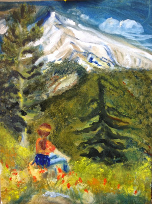 At this point, I took time out to paint a watercolor version of how the garden looked from a plant’s perspective which turned out whimsical and just plain fun. Without realizing it, I had also changed my perspective on what I was doing from the original oil landscape painting to imagining other perspectives.