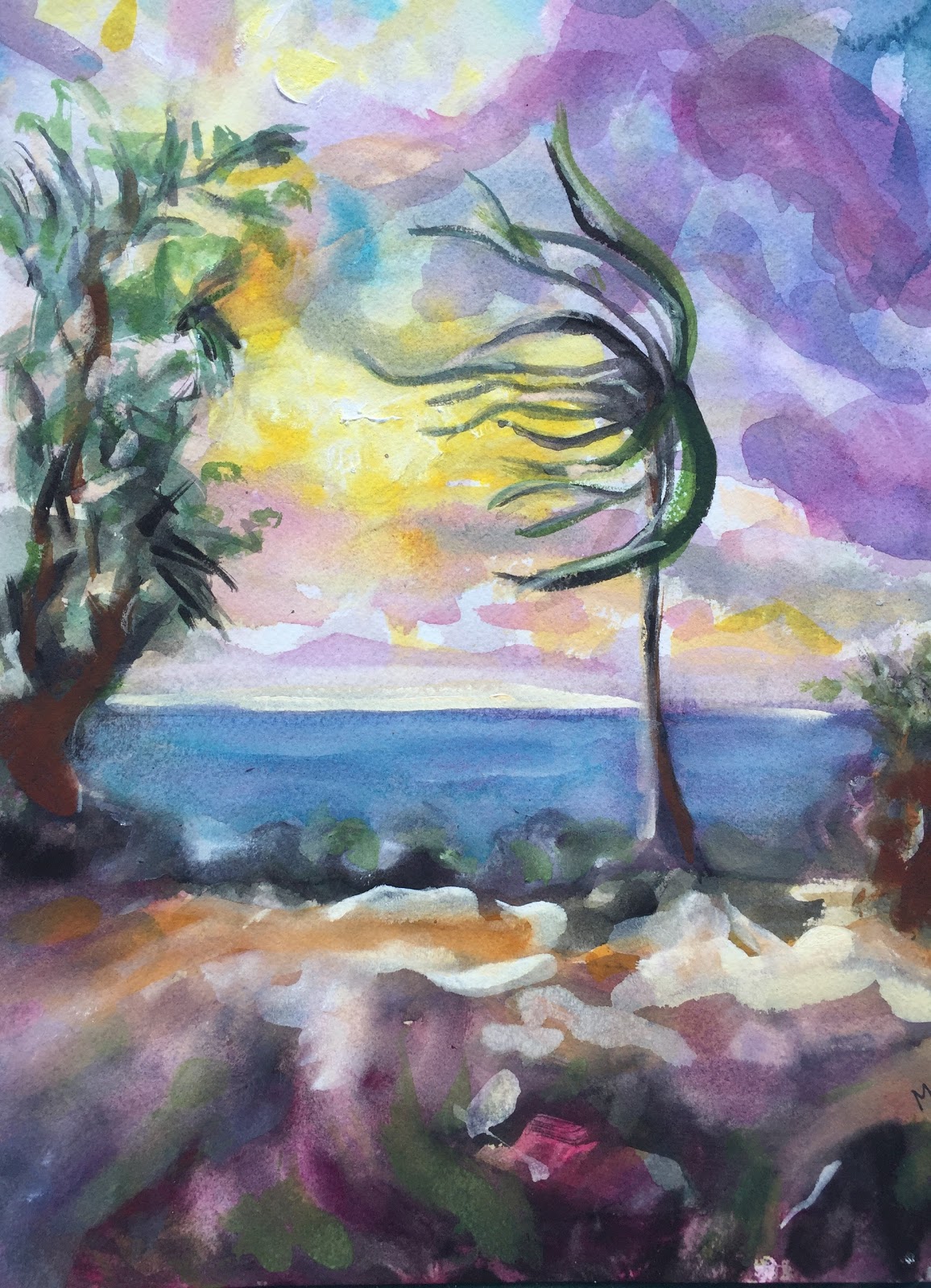 Since the beginning of the year I shifted from oils to watercolors. I am currently staying on an island in the Abacos, Bahamas and while painting, I am trying to to use as few chemicals as possible for cleaning up in order to minimize damaging the fragile environment.