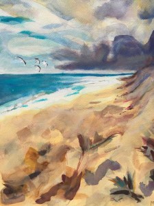After completing the small watercolor sketch (Perspective 1), I decided to try again in oils on canvas, this time with greater attention to the late afternoon ocean colors, but still using a similar structure for the painting, resulting in Perspective 2. This oil painting reflected more stillness with most of the movement being from the waves washing against the shore while the birds stayed in position enjoying feeding time while small waves washed over them.
