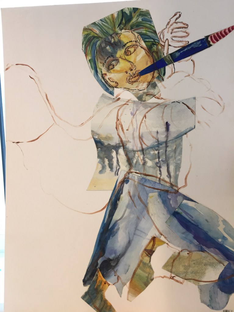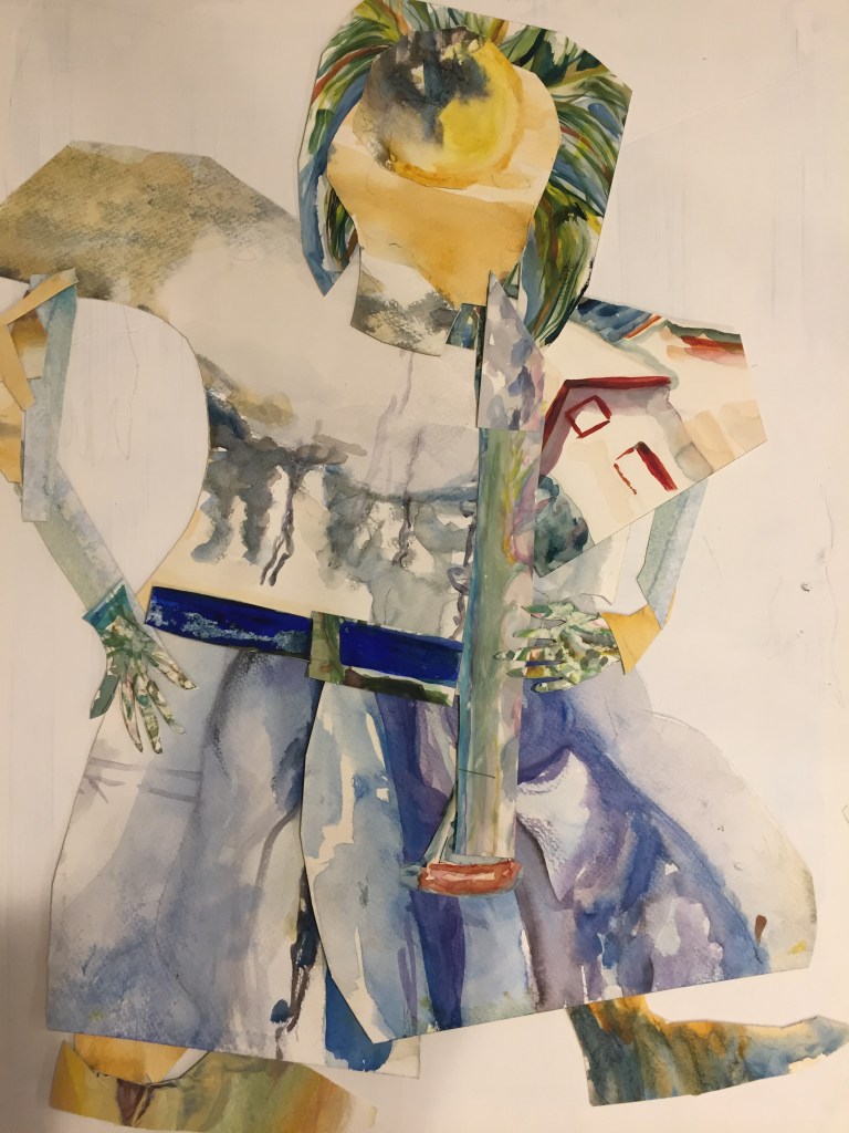For the class, I chose to cut up several watercolors of nature scenes that I had completed and then reshaped them into a collage of a child playing an instrument.