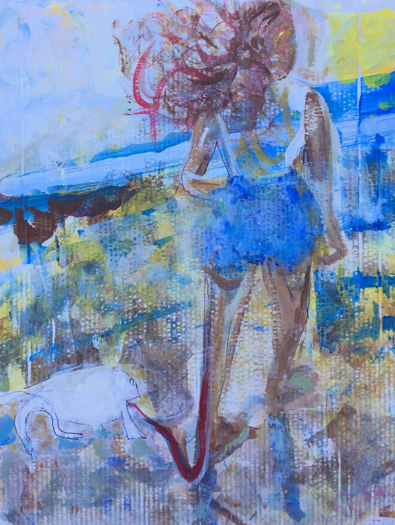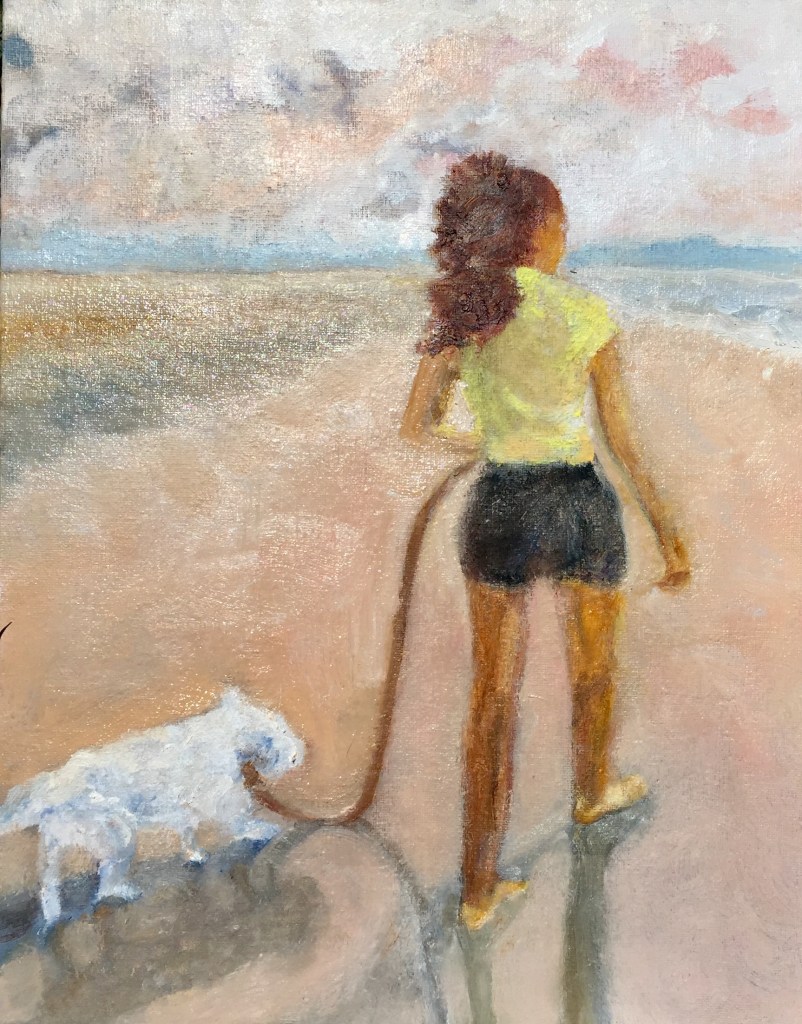 Recently, I started a series of paintings of a girl and her dog walking on the beach. The first one I completed was rather illustrative, but still leaning toward impressionistic.