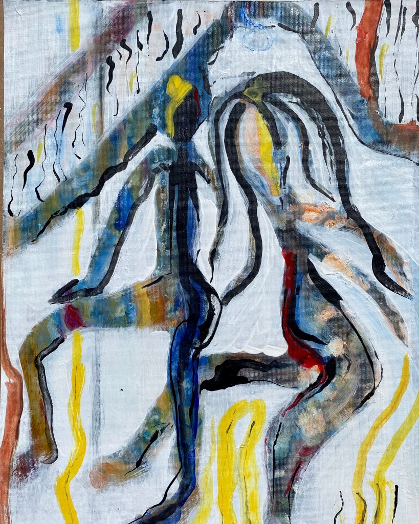 Below, is another version of a happy couple dancing. This one was painted by putting gesso over an old painting and using my hands and a wet cloth to produce the structure.