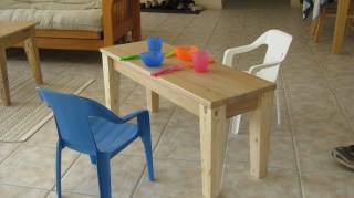 That big plank I showed you in the beginning is now the top of a children’s table. The legs of the children’s table are also made from boards that we picked up on the beach. This is a 100 percent “found it on the beach” table.