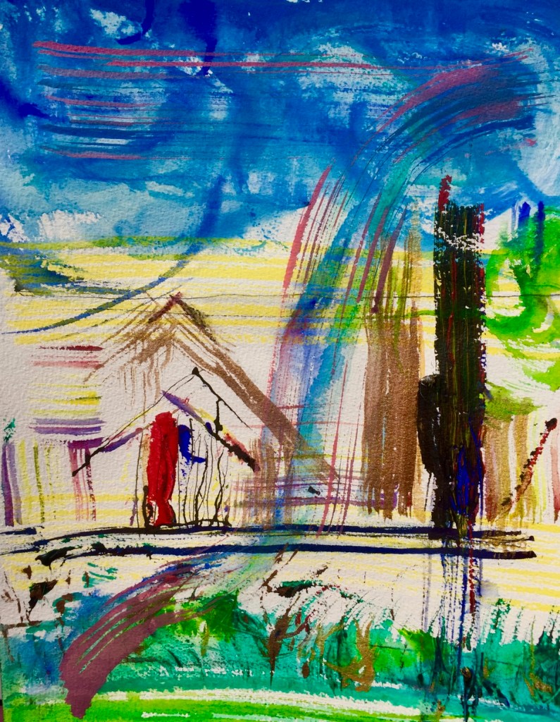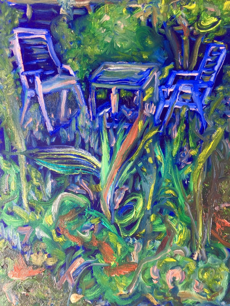 In the workshop, I tried to get a better grasp of Ruth’s techniques and perspective regarding the use of lines and marks in art, as she is a well-known artist of abstract paintings. When we received our workshop painting assignments, I chose to continue painting this same scene of my backyard garden, more abstractly, using as many aspects of Ruth’s workshop techniques as possible.