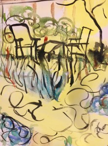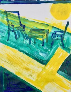 For her assignment, I started to describe the garden scene by using bold geometric lines using a large yellow Y shapes of sunlight to divide the chairs and table from plant life. I viewed these landscaping lines as compositional