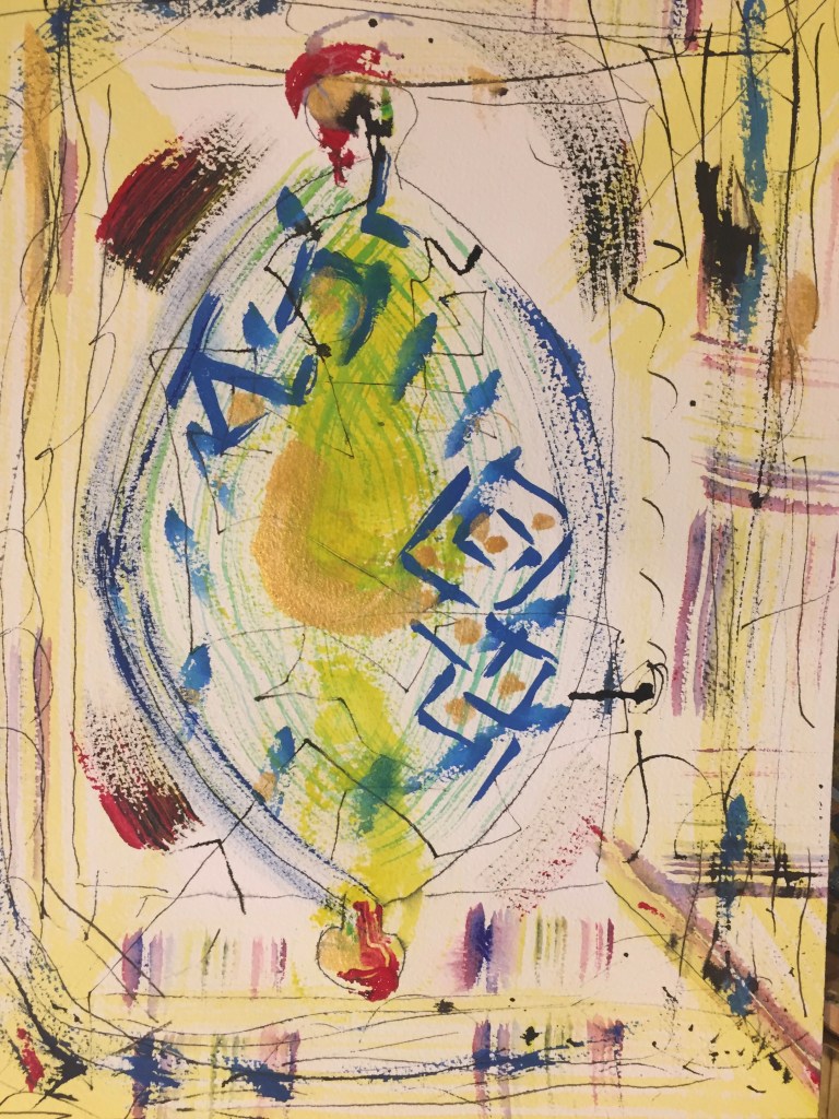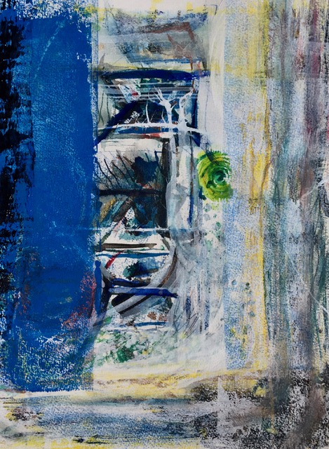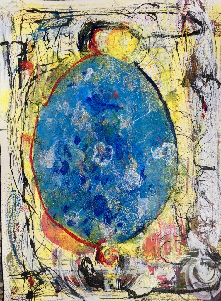 Then, I decided, over the same painting, to bring color, texture and line into the iconic inner sanctuary of the garden using the color blue and adding marks to show the garden’s intricacy. The painting ended up being simple in line, highly textured, using acrylic, water color and ink. See the painting, Garden Sanctuary.