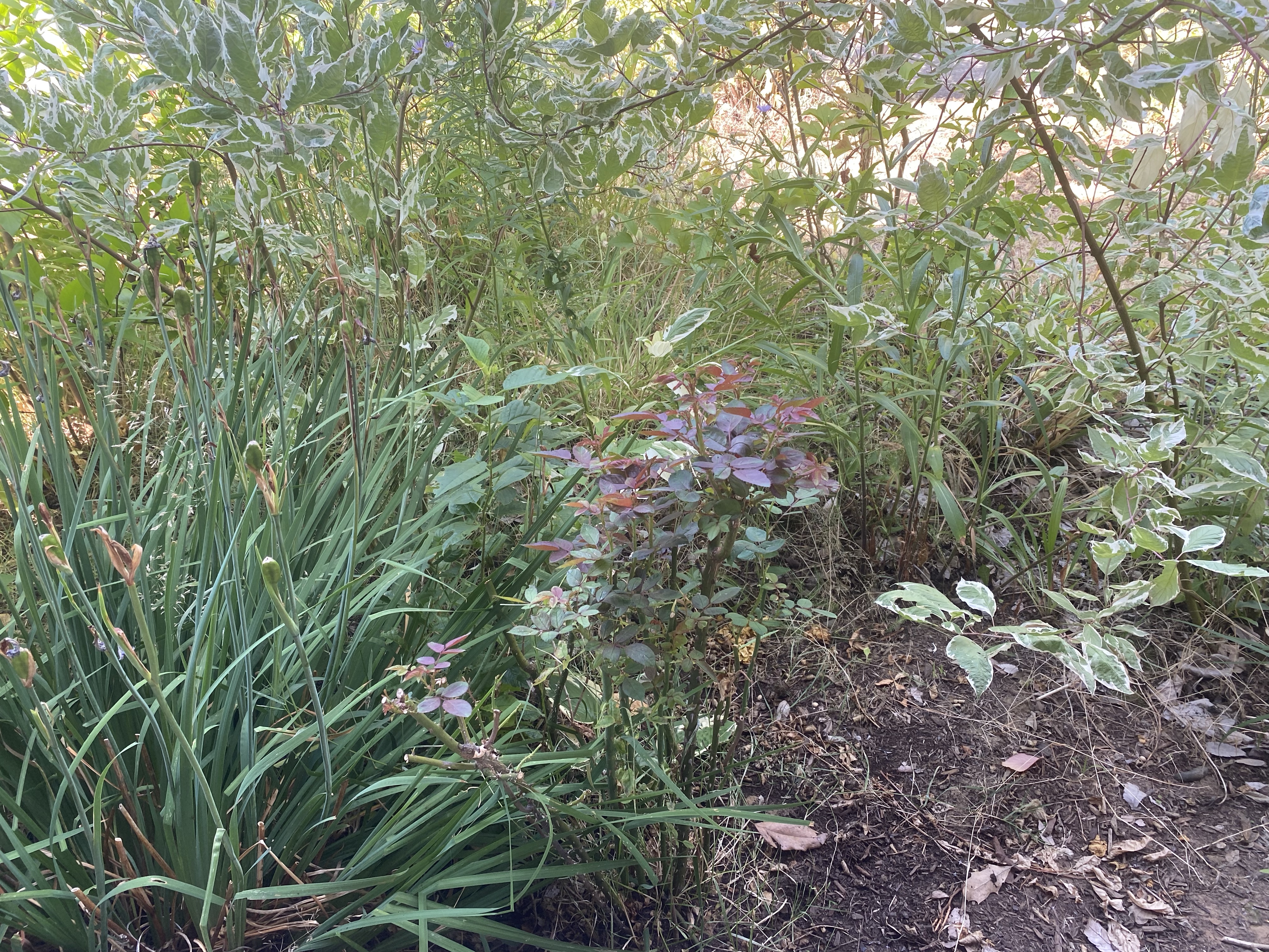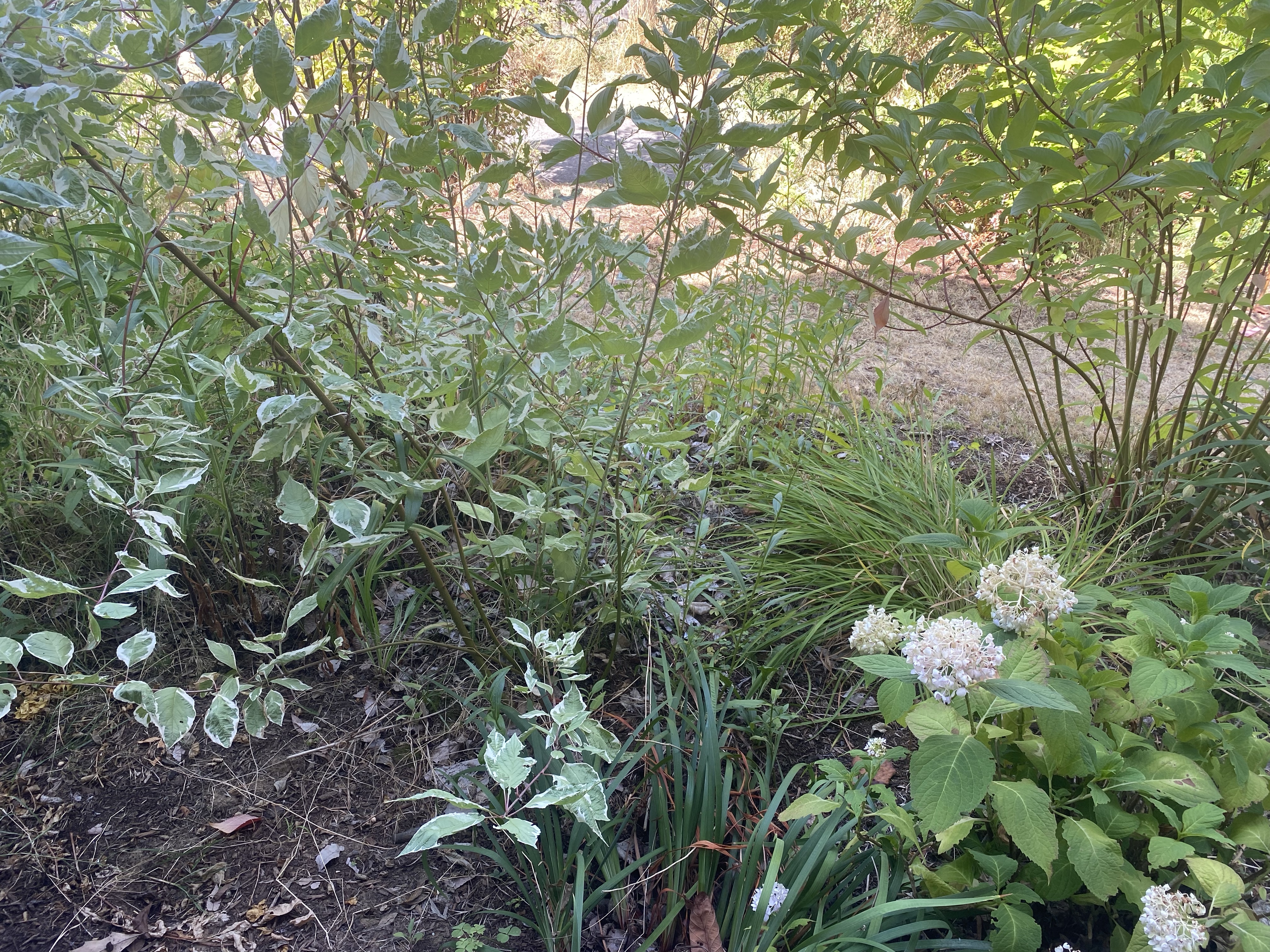 The hydrangeas peek out from under the Spicebush and show their big leaves.