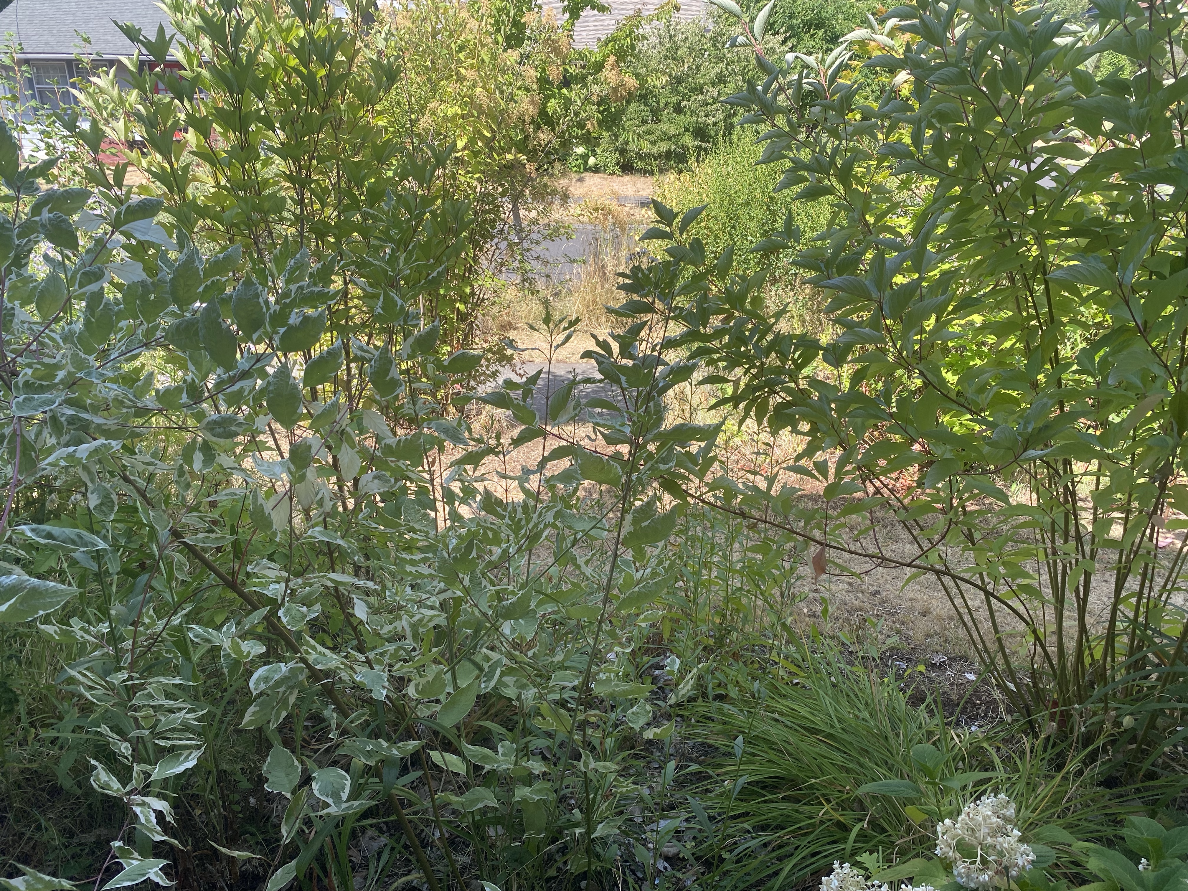 Photographed from top to bottom, one sees that we can still look out and see the neighbors’ beautiful trees and bushes, with less emphasis on the road between us.